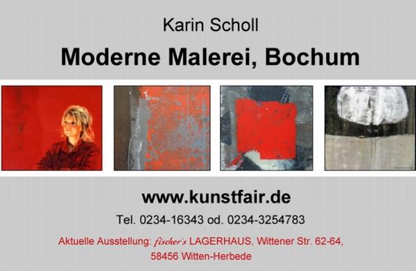 Was interessiert Sie? Was möchten Sie mir mitteilen? Haben Sie Fragen? Karin Scholl - Kornharpener Straße 126 A - 44791 Bochum - Mail: karin.scholl@kunstfair.de oder Gerne male ich auch Bilder in Ihrem Auftrag. Im Rahmen der Auftrags-Malerei können Sie über die Farben und Größe der Bilder mitentscheiden, ich berate Sie gerne, damit Sie das optimale Gemälde für Ihre Wohnung, Praxis oder Kanzlei erhalten. Teilen Sie mir Ihre Wünsche einfach per E-Mail oder PN auf Facebook mit.